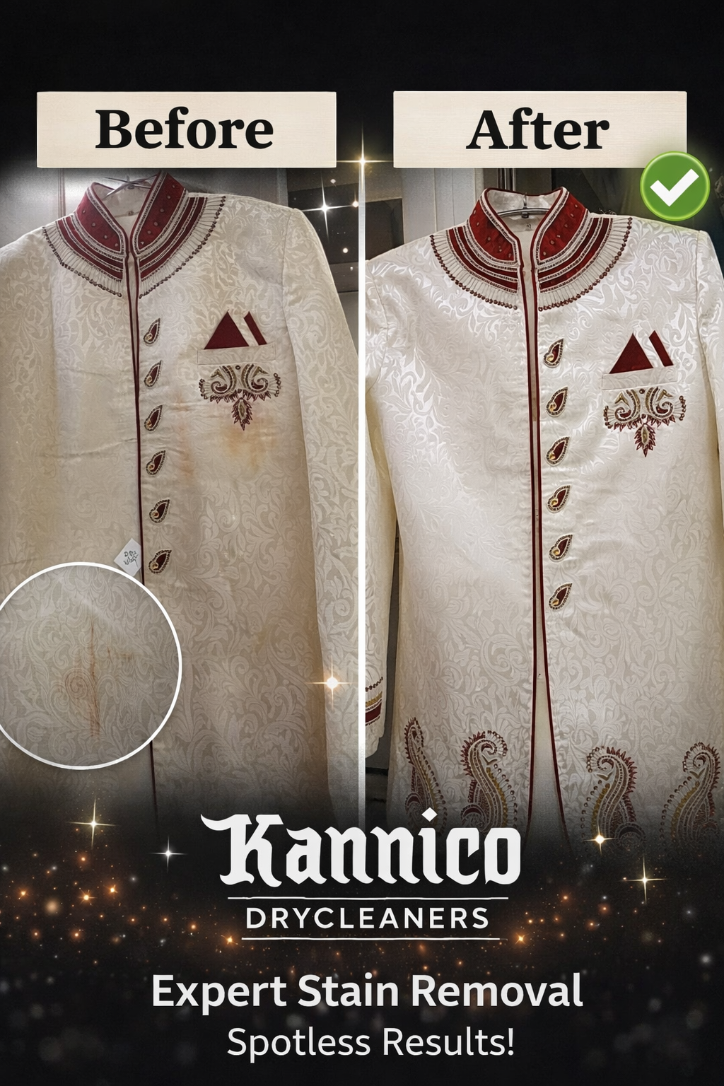 Hard grease, oil, ink, Pan Masala and wedding wear stains removed with precision.